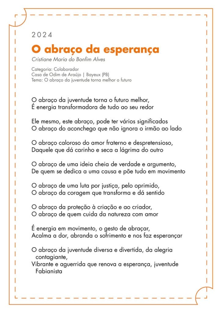 O Programa Pedagógico Clube de Mídia, do Lar Fabiano de Cristo, promoveu o 6º Concurso de Poesias. O tema de 2024 foi “O abraço da juventude torna melhor o futuro”. Como de praxe, a competição foi dividida em duas categorias: Jovem Clube de Mídia, destinada aos coparticipantes, e Colaborador, para os funcionários da instituição.