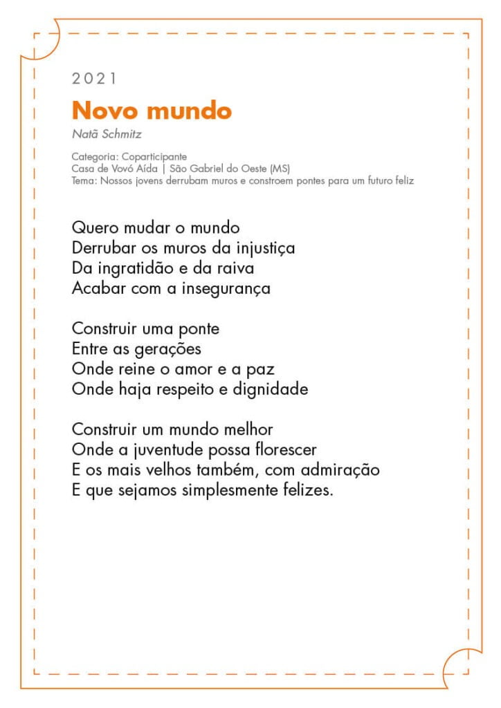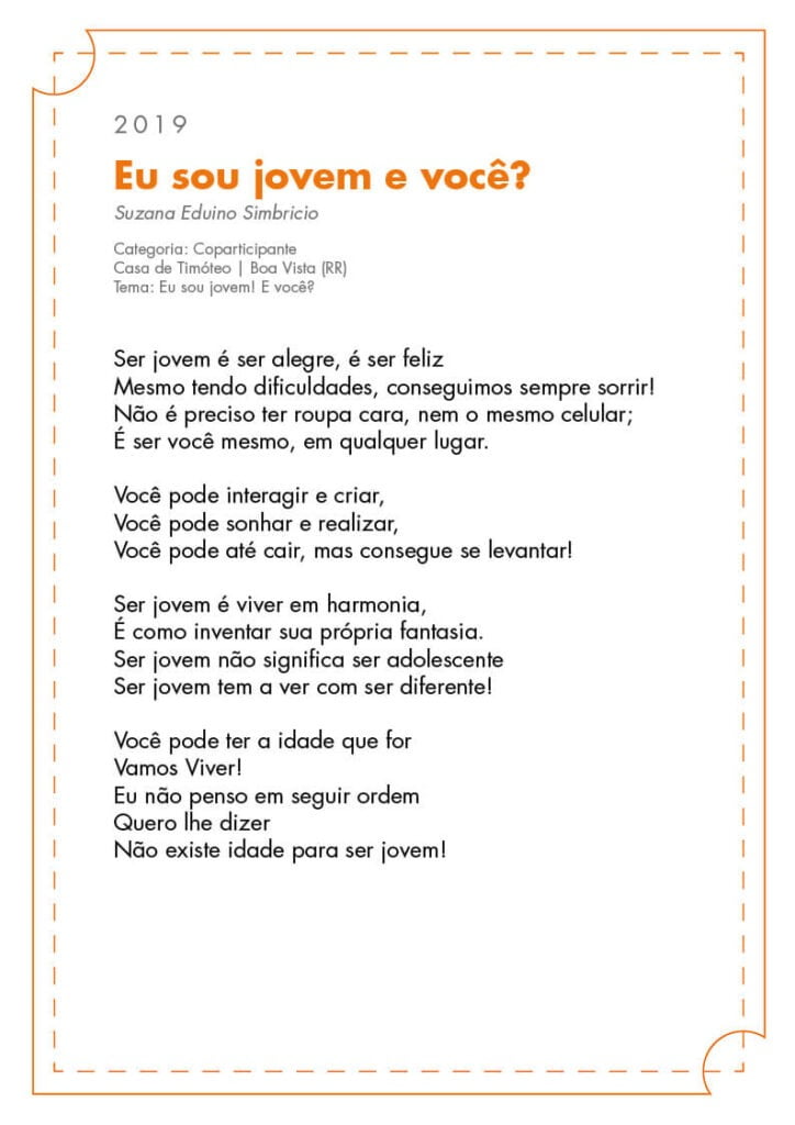Em 2022, a coparticipante da Casa de Odim de Araújo, em Bayeux (PB), Micheline Bárbara de Carvalho, venceu na categoria Jovem Clube de Mídia com a poesia “Sejamos protagonistas dessa Nação”. Na categoria Colaborador, Lívio Teixeira, da Casa de Pedro Richard, no Rio de Janeiro (RJ), venceu com a poesia “O sonho de cada dia”. Leia ambos os poemas abaixo.